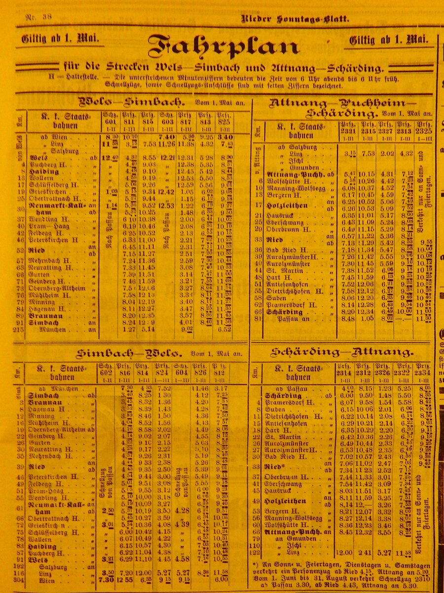 Fahrplan Sommer-1906 für die Strecken Wels-Simbach und Attnang-Schärding; abgedruckt im Rieder Sonntagsblatt Ausgabe Nr.38/1906; Bildaufnahme:250216