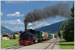 SKGLB 22 bespannte am 19.7.2018 einen Sonderzug von Mauterndorf in der Ferienregion Lungau, nach Murau und wieder retour. Die Aufnahme zeigt den Zug bei der Retourfahrt in St. Lorenzen.