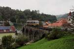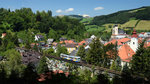 Ein Triebwagenzug der Murtalbahn Ende August 2019 kurz vor der Ankunft am Bahnhof Ramingstein-Thomatal.