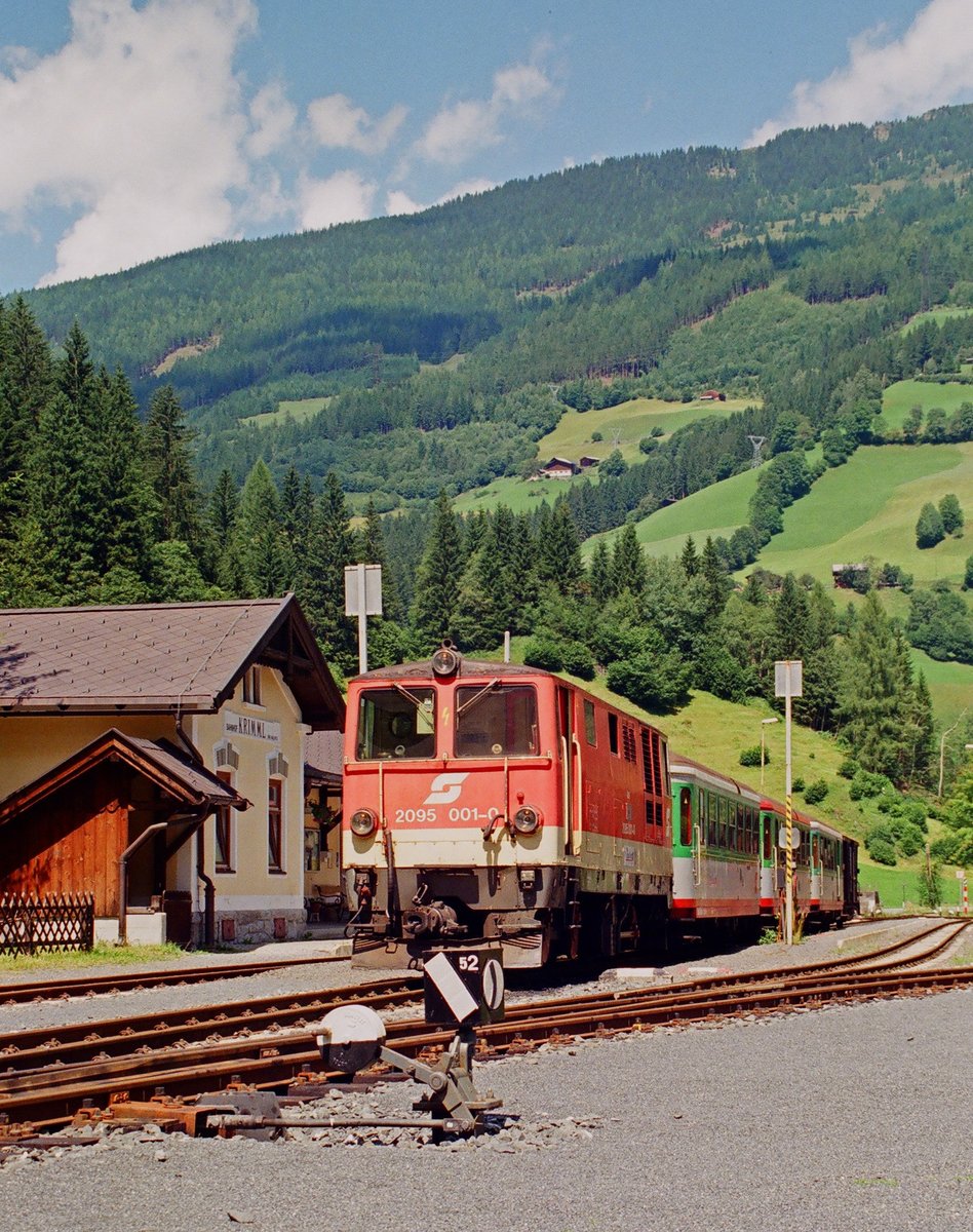 18.07.1998	Bahnhof Krimml, Endbahnhof der Pinzgauer Bahn von Zell am See. Lok ÖBB 2095 001-0 mit Zug