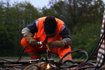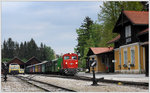 Die Schmalspurgleisstopfmaschine wird vom geschobenen Bauzug verfolgt. Stainztal am gestrigen 11.05.2016