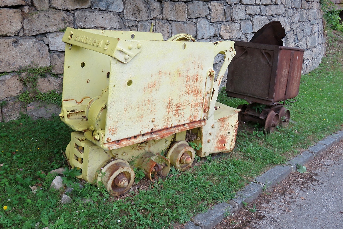EIMCO Wurfschaufellader, Modell 12B von 1938, und eine Lore erinnern an ein ehemaliges Bergwerk in Neuberg an der Mürz, 7.7.2019