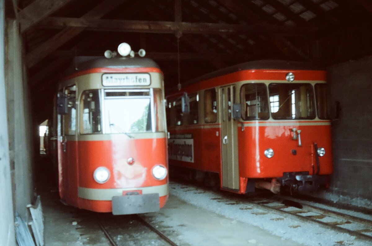 August 1983. Entschuldigen Sie die qualitätslose Aufnahme, die ich nur wegen des außergewöhnlichen VT 1 der Zillertalbahn hier eingestellt habe: Ein umgebauter ET bestehend aus drei Wagen, von Rotterdam erworben und als Museumszug nach seiner Zeit bei der Zillertalbahn wieder dorthin zurück gelangt (und rechts daneben VT 2 der Zillertalbahn), wobei VT 1 ursprünglich als DB-Baureihe ET 195 geführt wurde.