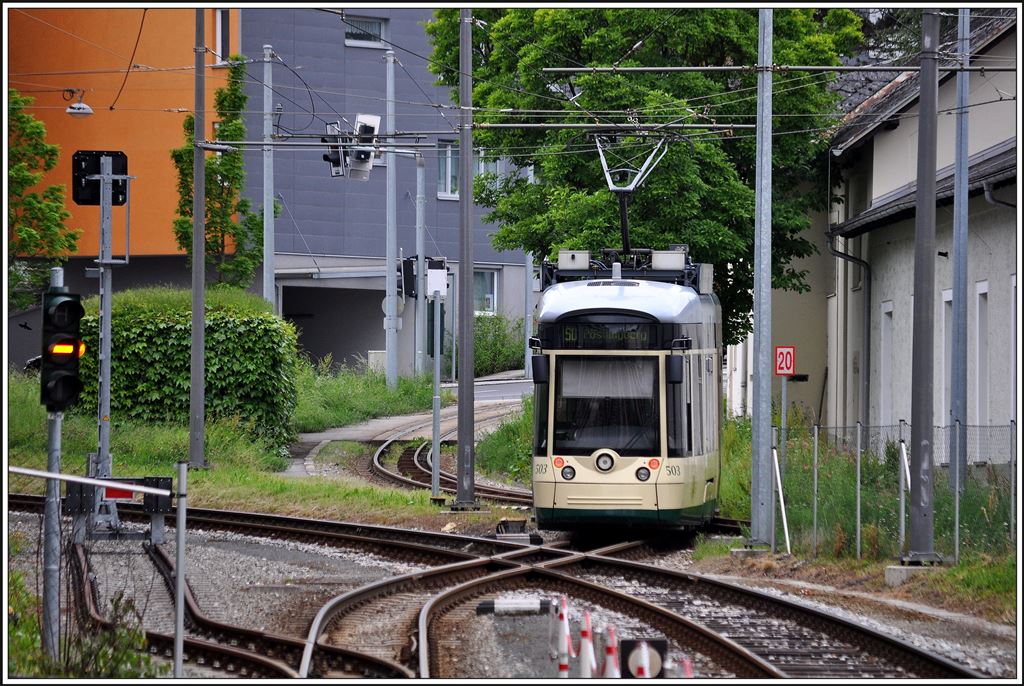 An der Landgutstrasse kreuzt die schmalspurige Pöstlingbergbahn die Mühlkreisbahn der ÖBB. (30.05.2014)