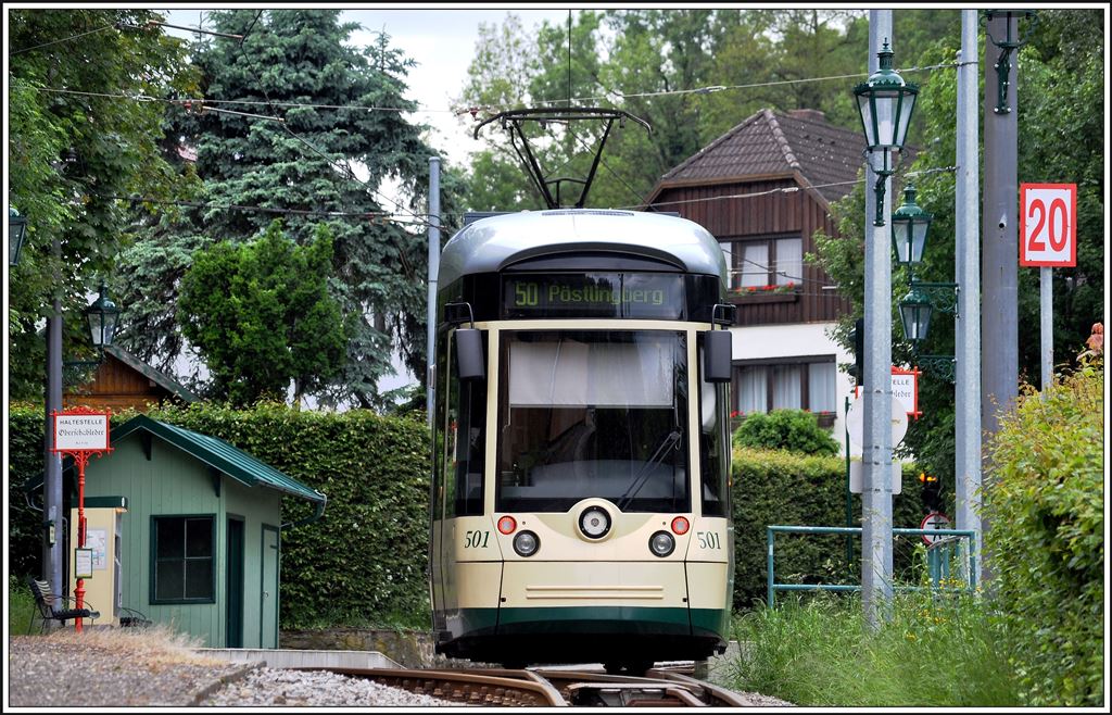 Wagen 501 an der Haltestelle Oberschableder. Bild ausgetauscht wegen des abgeschnittenen Stromabnehmers. (30.05.2014)