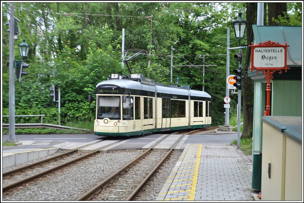 Wagen 501 fährt in die Kreuzungsstation Hagen ein (30.05.2014)