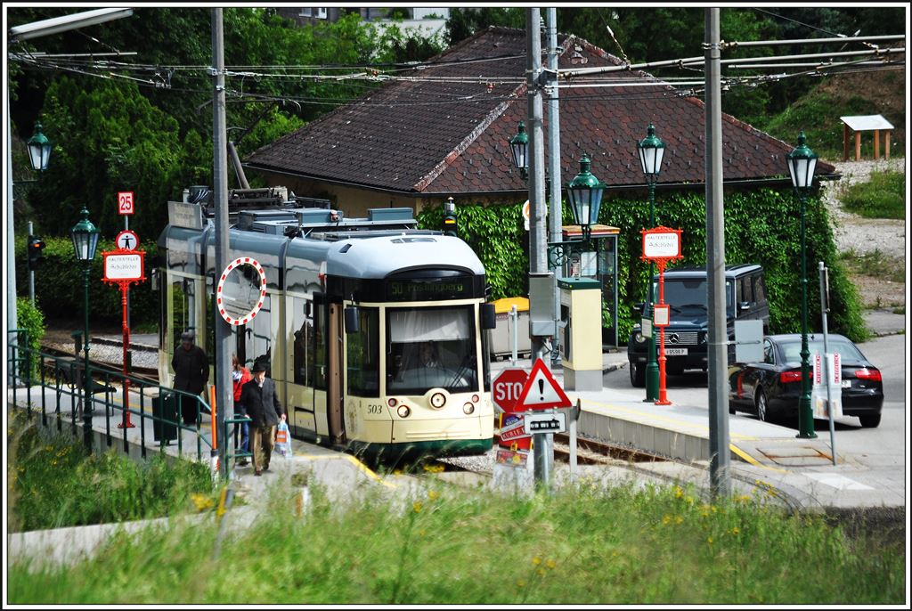 Der Triebwagen 502, ein dreiteiliger vierachsiger Zweirichtungs-Niederflur-Gelenktriebwagen vom Typ Bombardier „Mountainrunner“ verlässt am 04 April 2025 die Bergstation Pöstlingberg (519 m ü.M.) und fährt als Linie 50 (der Linz Linien GmbH) hinab zum Hauptplatz in Linz. Die Pöstlingbergbahn wurde von 1.000 mm auf 900 mm umgespurt und ist seit 2009 mit dem übrigen Netz der Straßenbahn Linz verknüpft die auch auf der Spurweite 900 mm fährt. Aber für die Linie 50 „Pöstlingbergbahn“ braucht man ein separates Ticket. Die Pöstlingbergbahn wird, wie das gesamte Straßenbahnnetz, von der Linz Linien GmbH betrieben und gilt, mit einer maximalen Steigung von 116 ‰, als eine der steilsten Adhäsionsbahnen der Welt. Seit 1898 beeindruckt die Linzer Pöstlingbergbahn Gäste aus aller Welt mit ihrer außergewöhnlichen und idyllischen Streckenführung.
