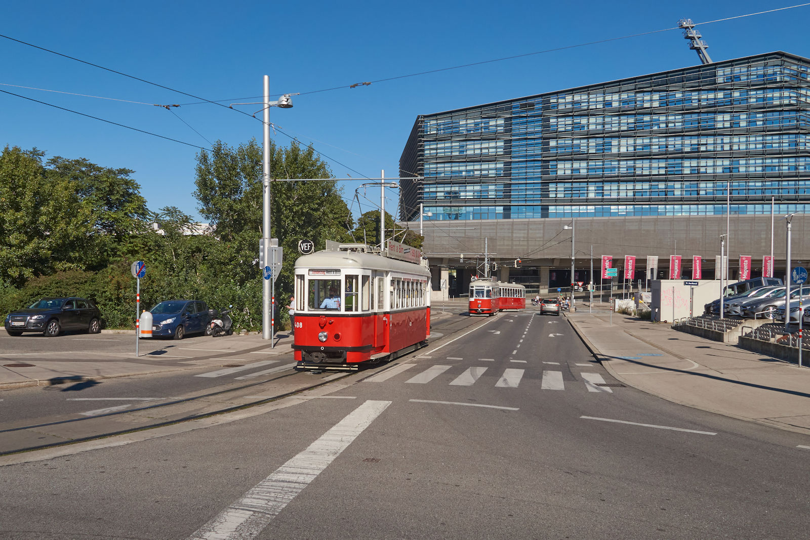 Wien Wiener Stadtwerke-Verkehrsbetriebe (WVB) SL T (T1 414 (Lohnerwerke 1954, UB aus T-414)) I, Innere Stadt, Schottentor im August 1969. - Scan eines Diapositivs.