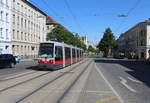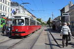 Wien WL SL 43 (E1 4862 + c4 1352) Hernalser Hauptstraße / Taubergasse am 1. Juli 2015. - Wegen technischer Probleme des früheren Zuges, der in der Haltestelle Rosensteingasse (hinter dem Fotografen) hielt, gab es eine kurzzeitige Störung des Straßenbahnverkehrs, die einen Stau verursachte.