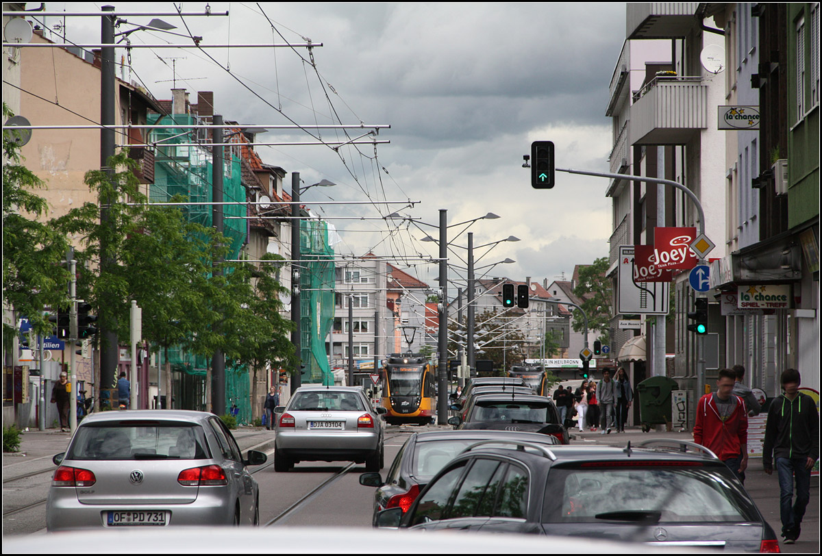 Ich finde es interessant gerade bei der Straßenbahnfotografie den Kontext und die Straßenbahn stärker zu verknüpfen. Dann dürfen schon auch Autos oder Personen die Bahn etwas verdecken. Die Bahn darf ruhig auch mal etwas in den Hintergrund treten und das städtische Umfeld und die Bahn eher gleichwertig das Bild bestimmen. So kann das rege Leben an einer stark frequentierten Haltestelle gezeigt werden oder aber auch das 'Mitschwimmen' der Bahn im Autoverkehr. Oder man kann unterschiedliche Situationen städtische Lebens mit der Straßenbahn kombinieren. Ich finde nicht das eine Straßenbahn immer unverdeckt und in ganzer Länge aufs Bild muss und die Stadt drumherum nur zur Hintergrundkulisse wird dadurch und nur wenig Beziehung zur Straßenbahn aufnimmt. Spannend finde ich bei Straßenbahnen auch immer die Streckengestaltung, gerade bei Neuanlagen, fügt sie sich gut ein, wurde der Platz für die Autos reduziert, wurde ein Stück mehr an Urbanität geschaffen.
