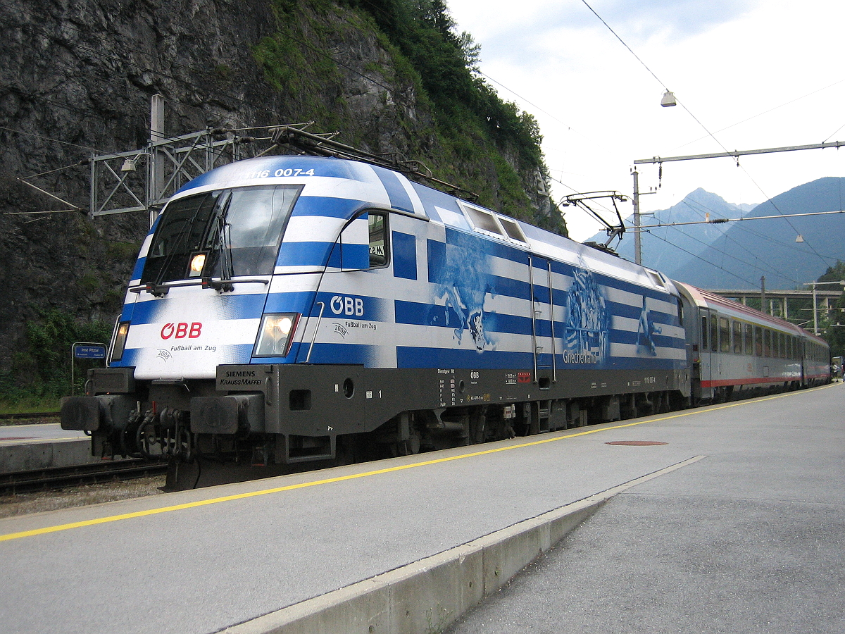 ÖBB 1116 007-4 "EM Griechenland" an einem EC nach Wien Westbahnhof beim Zwischenhalt im Bahnhof Imst-Pitztal. Aufgenommen am 22.08.2008