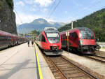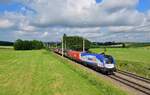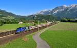 ÖBB 1116 199-1 "60 Jahre Roco" und ÖBB 1016 032-7 vor einem Kontainerzug nach Wolfurt bei einem kurzen Zwischenhalt in Imst-Pitztal. Aufgenommen am Abend des 06.09.2021