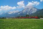 Bis August 2020 trugen noch alle für die S-Bahn-Tirol fahrenden Talent-Garnituren das alte Schrägdesign. Gleich drei dieser Triebwagen konnten am 30. Juli 2020 unweit der Ortschaft Flaurling aufgenommen werden: Während eine Doppeleinheit als REX 5392 auf dem Weg nach Landeck-Zams den Standpunkt des Fotografen passierte, schob sich der inzwischen nach Wien umstationierte 4024 095 als S 5123 von der anderen Seite ins Bild hinein.