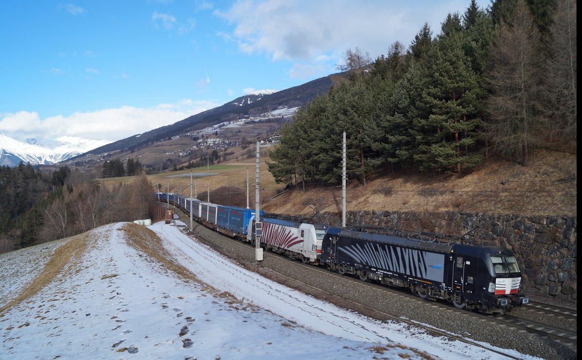 193 663 + 193 774 mit einem KLV-Zug nach Verona Quadrante Europa bei Mühlbachl am Brenner, 31.01.2020.