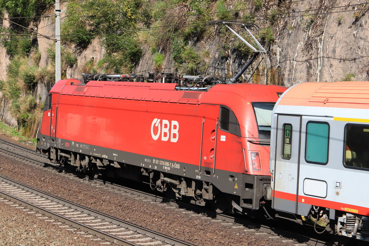 Nachschuss auf die ÖBB 1216 006-7 vor dem EC 80 von Verona P.N. nach München Hbf. Aufgenommen bei Gries am Brenner am 25.09.2021