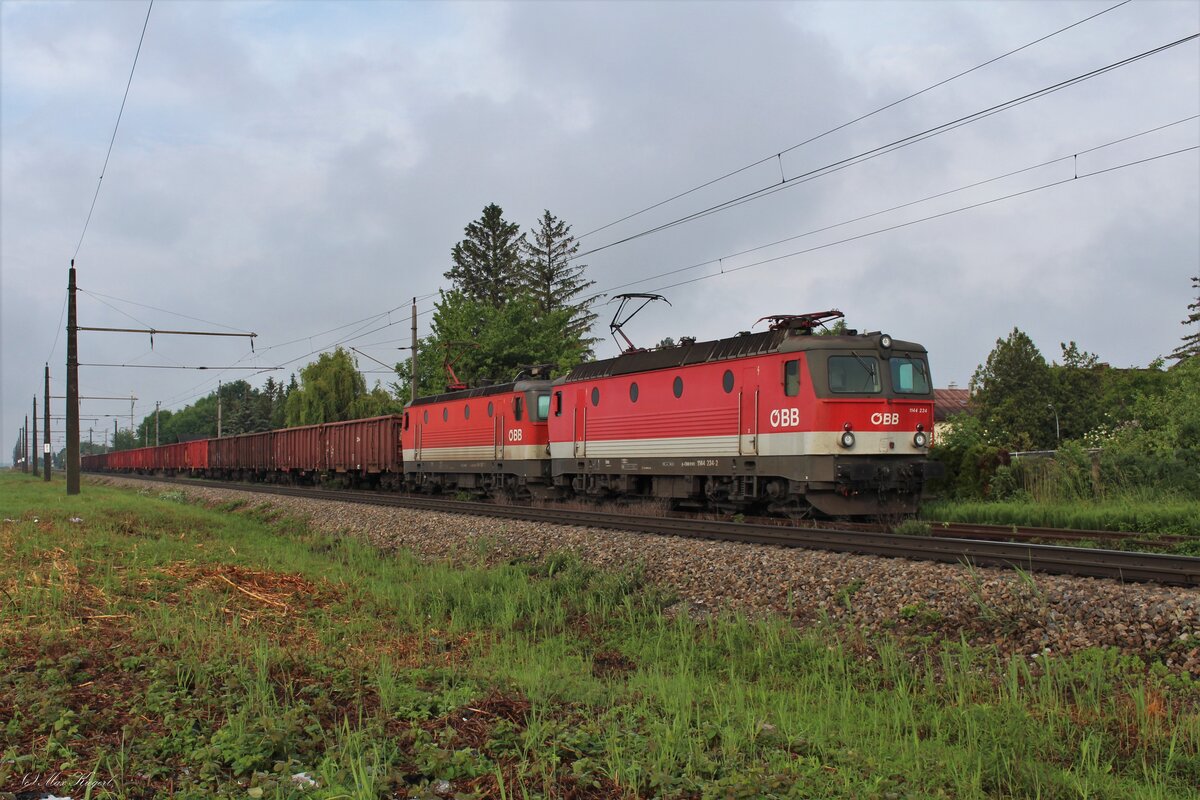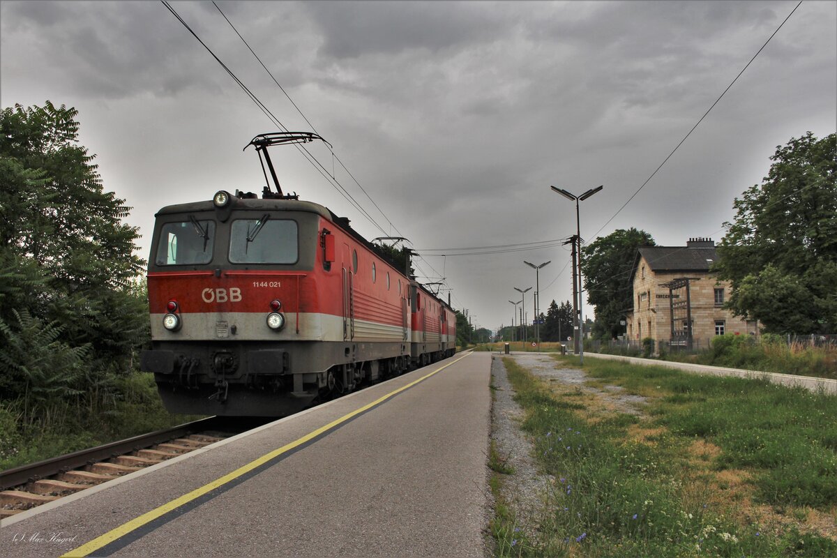 In der letzten Abendsonne des 19.4.2019 steht die 1116 158 "Licht ins Dunkel" im Bahnhof Wampersdorf und holt hier den abgespannten G54507.
