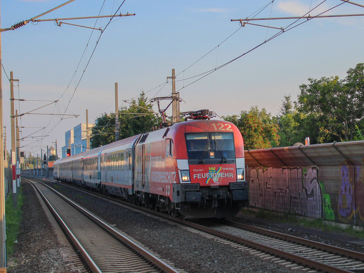 Graz. Die ÖBB 1016 048 zog am 30.07.2020 den EC 150 von Spielfeld nach Wien, hier in Graz Don Bosco.