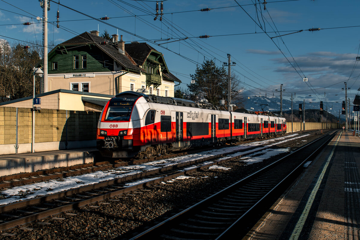 Zugbegegnung am 10.02.2026 im Bahnhof Pusarnitz, dem neuen Endbahnhof der Kärntner S-Bahn-Linie 1.