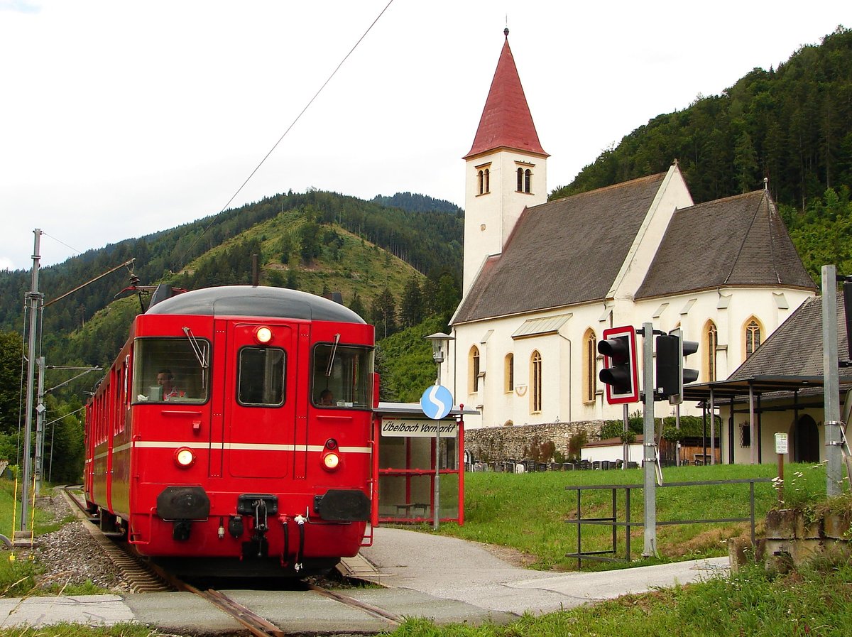 Ein vor dem Bahnhof Übelbach abgestellter ET der Übelbacherbahn (frühere österreichische Lokalbahn), evtl. ET 11 StLB (?). Auf der früheren österreichischen Lokalbahn (Peggau-Übelbach, StLB) wurde später eine S-Bahnlinie eingerichtet (Unternehmen Steiermarkbahn). ET 11 StLB (zuvor 4042.01 ÖBB) ist noch als vielbenutzter Museumswagen der NBiK (Nostalgiebahnen in Kärnten) vorhanden.