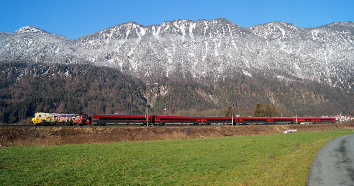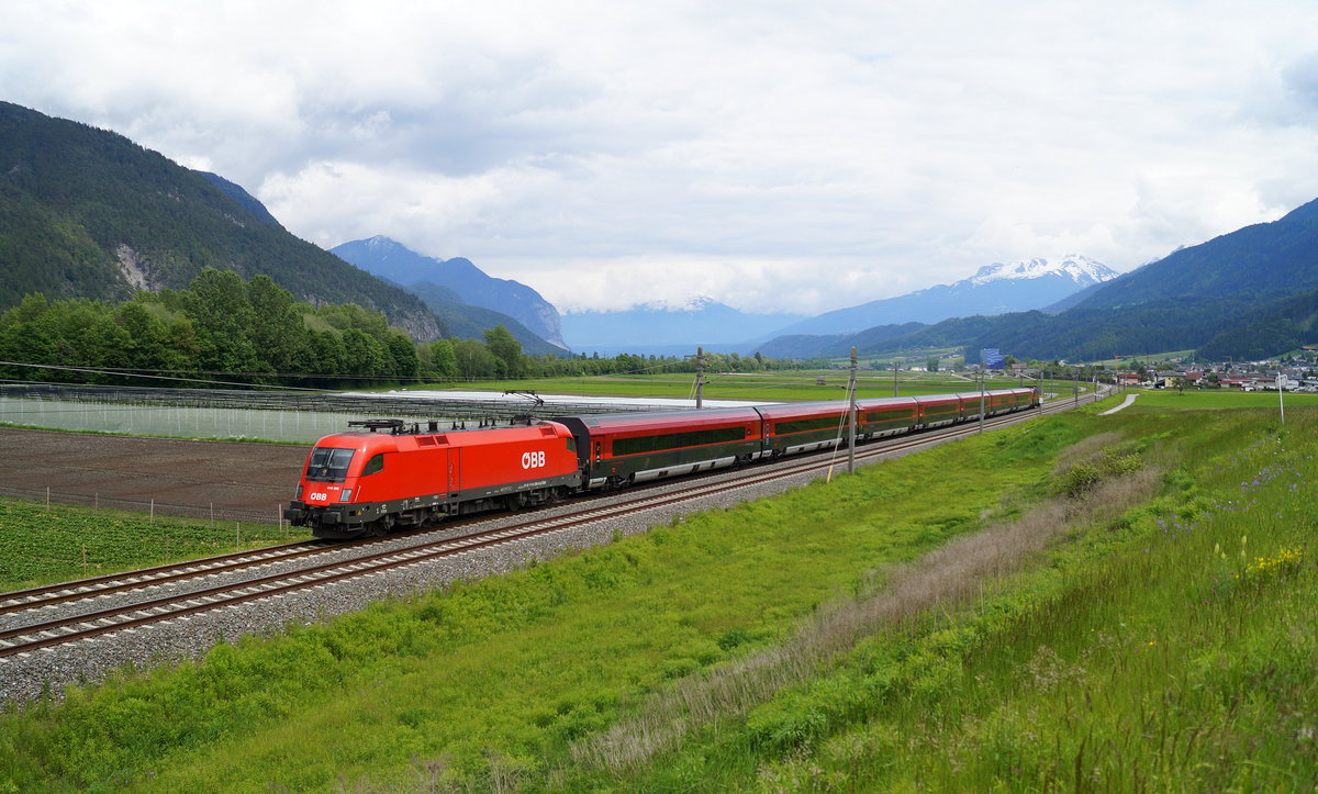 Mit mehr als 90 Minuten Verspätung war der RJ 662 "Achensee" (Flughafen Wien - Bregenz) am 30. Mai 2019 unterwegs. Interessanterweise verkehrte die Leistung auch mit 2 Lokomotiven der Reihe 1116. Eine davon war die verkehrsrote 1116 266, die den Zug hier zwischen Flaurling und Oberhofen im Inntal in Richtung Arlberg anführt. Markus