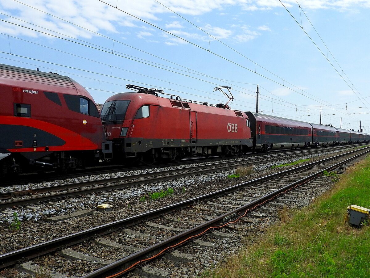 Im heftigen Gewitterregen fährt der railjet 67 Richtung Wien Westbahnhof.