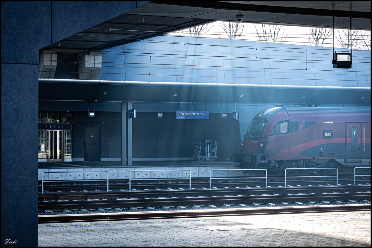 Neue Fotomotive verspricht die Koralmbahn im neuen Jahr . Ein Railjet am  18. Dezember 2025 im Bahnhof Weststeiermark.