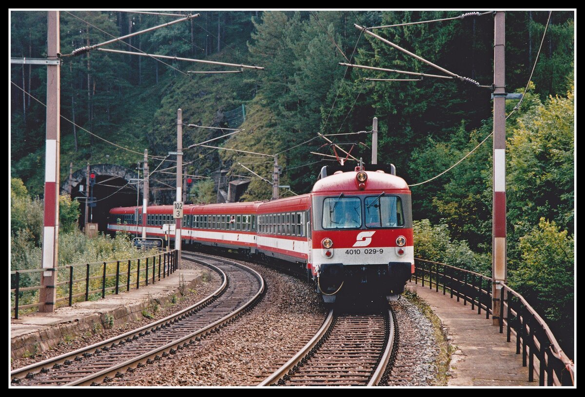 4010 029 fährt am 14.09.2000 als IC534 (Villach - Wien Süd) auf dem Kartnerkogelviadukt über den Semmering. Von der Reihe 4010 wurden von 1965 bis 1978 29 Einheiten geliefert, der 4010 029 war also der letztgebaute seiner Reihe.