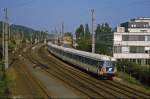 An einem heißen Augustwochenende 1987 fährt der 4010 014 hier bei Hochgrieß bergwärts auf den Olfapass. Der gut 40 Minuten verspätete Ex137 verbindet hier Innsbruck mit München.