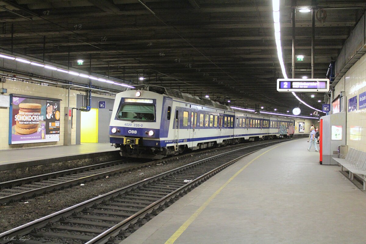 In der noch recht düsteren Haltestelle Wien Quartier Belvedere wartet am 7.9.2013 der 4020 235 auf der Schnellbahnlinie S2 von Mistelbach nach Wiener Neustadt auf die Abfahrt.