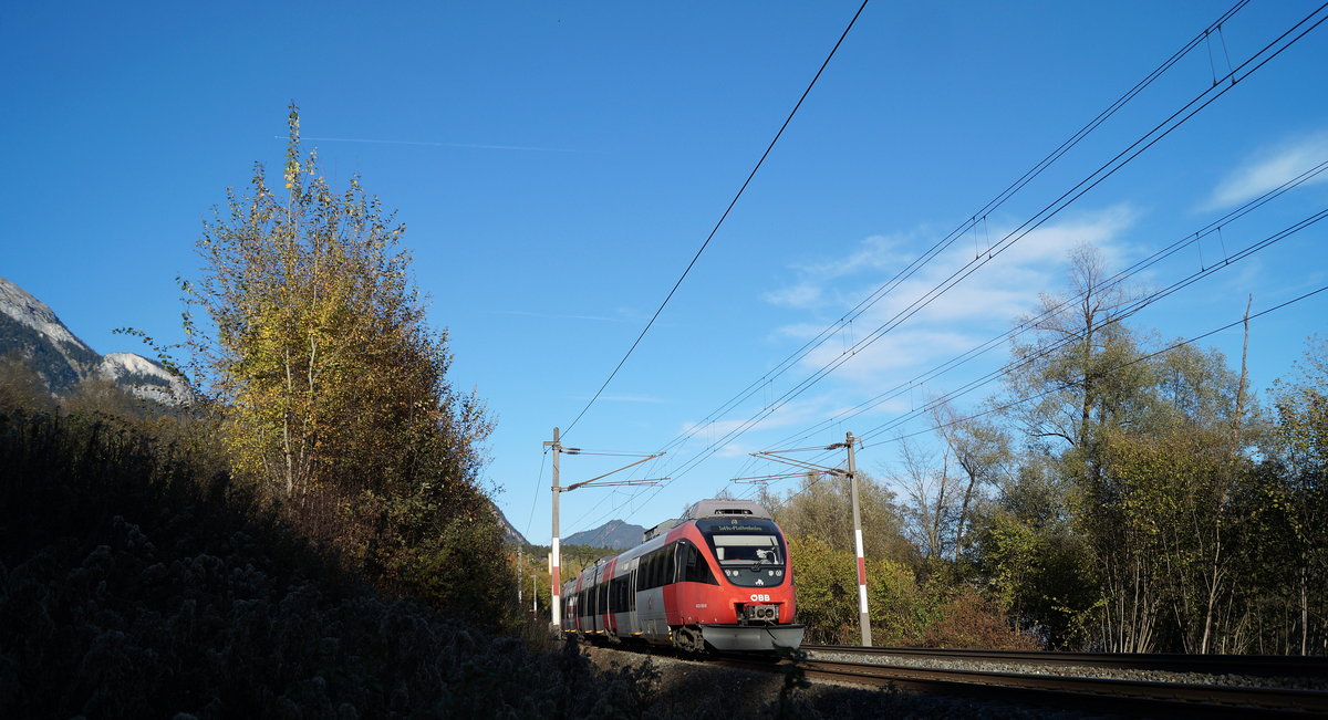 In den letzten Sonnenstrahlen des Novembertages fährt 4024 060-8 gemächlich bei Jenbach seinem Bestimmungsbahnhof Telfs-Pfaffenhofen entgegen, während die umliegende Landschaft im Tiroler Unterinntal von herbstlicher Stimmung geprägt ist (02.11.2019).