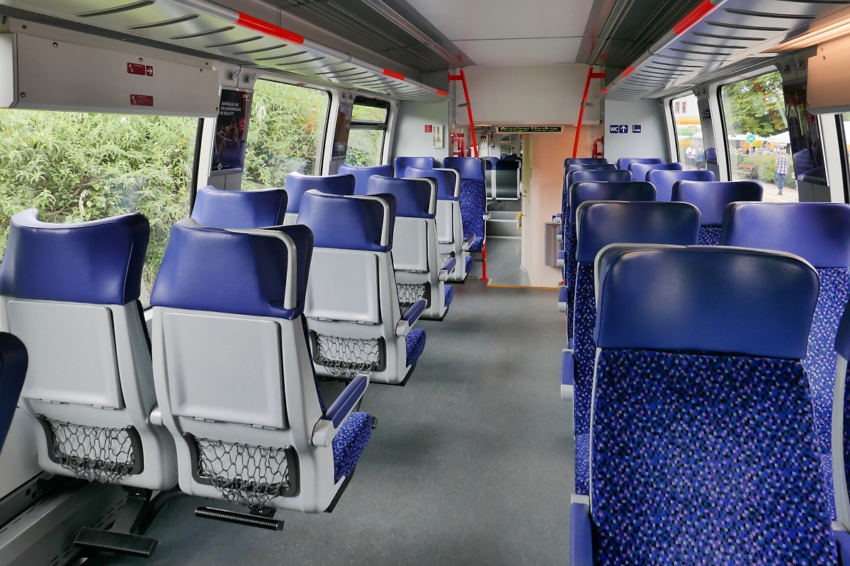 Innenraum des Elektrotriebwagens 4024 043-4 TALENT der ÖBB / S-Bahn Steiermark im Bahnhof Übelbach anlässlich einer Fahrzeugausstellung zur 100-Jahr-Feier der Strecke Peggau-Übelbach, 04.08.2019
