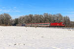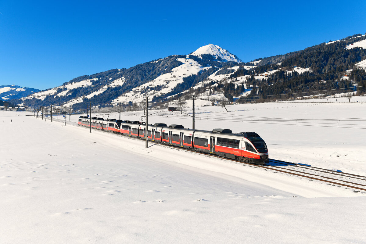Aufgrund des Hahnenkamm Rennens wurde die S 5023 von Wörgl nach Hochfilzen am 20. Januar 2024 mit einer Doppelgarnitur Talente geführt. Führendes Fahrzeug war der 4024.057. Bei Brixen im Thale konnte ich den Nahverkehrszug vor der verschneiten Hohen Salve dokumentieren.