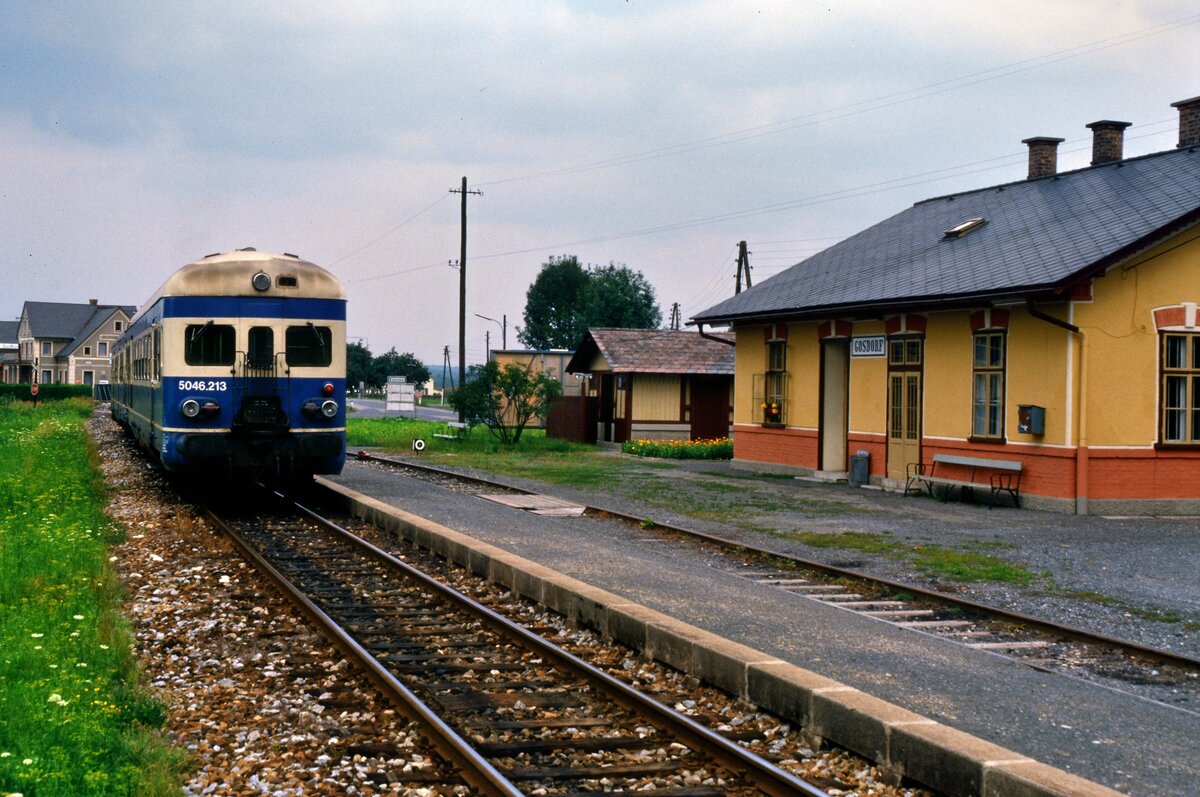 Zug der ÖBB-Baureihe 5046 (SGP), vorn Motorwagen 5046.213, auf der ÖBB-Bahnlinie Nr.46201 am Bahnhof Gosdorf (Österreich 1984)