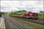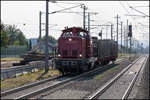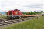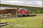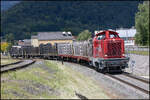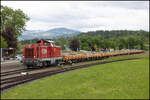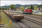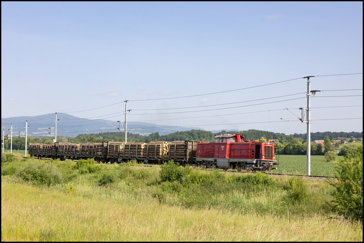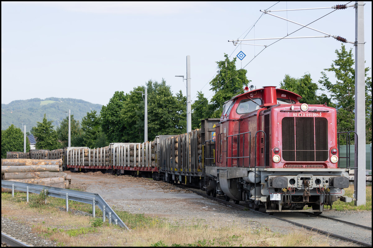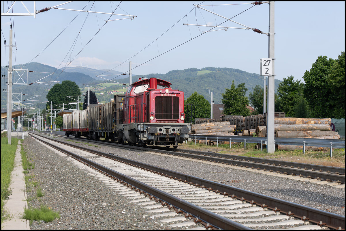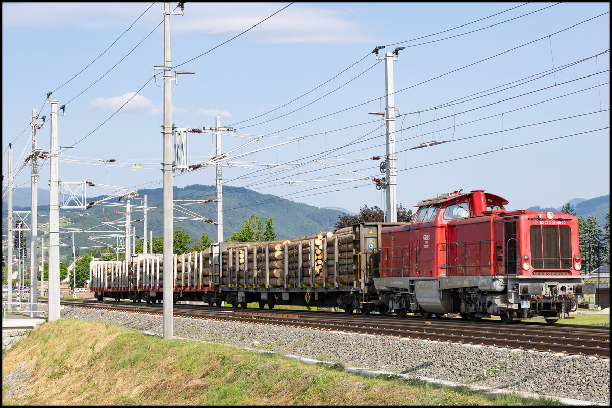 Regelmäßig wird in Frauental Bad Gams Holzverladen . Hier am 6. Juni 2025 stellt GKB DH 1100.1 frische Fracht bei.