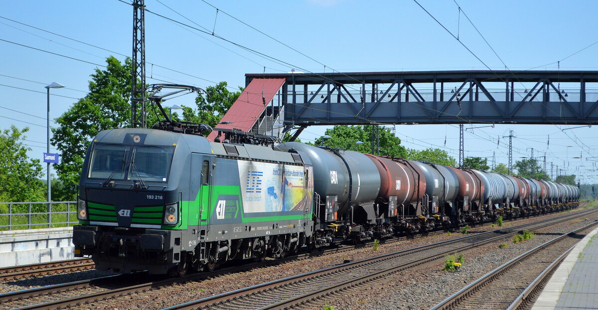 LTE Logistik- und Transport GmbH, Graz [A] mit der ELL Vectron "193 216" [NVR-Nummer: 91 80 6193 216-9 D-ELOC] und Kesselwagenzug am 18.05.22 Durchfahrt Bf. Saarmund.
