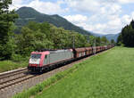 Im Jahr 2008 wurde die 185 590 für die nicht mehr existierende Crossrail AG gebaut, und in deren Hausfarben lackiert. Am 07. Juni 2019 war die besagte Maschine an die LTE vermietet, und dem WeKo (Werndorf Kohle) 48099 vorgespannt, und wurde von mir in Peugen bei Frohnleiten fotografiert. Damals wurde das mittlerweile eingemottete Fernheizkraftwerk Mellach hauptsächlich mit polnischer und tschechischer Steinkohle beliefert.