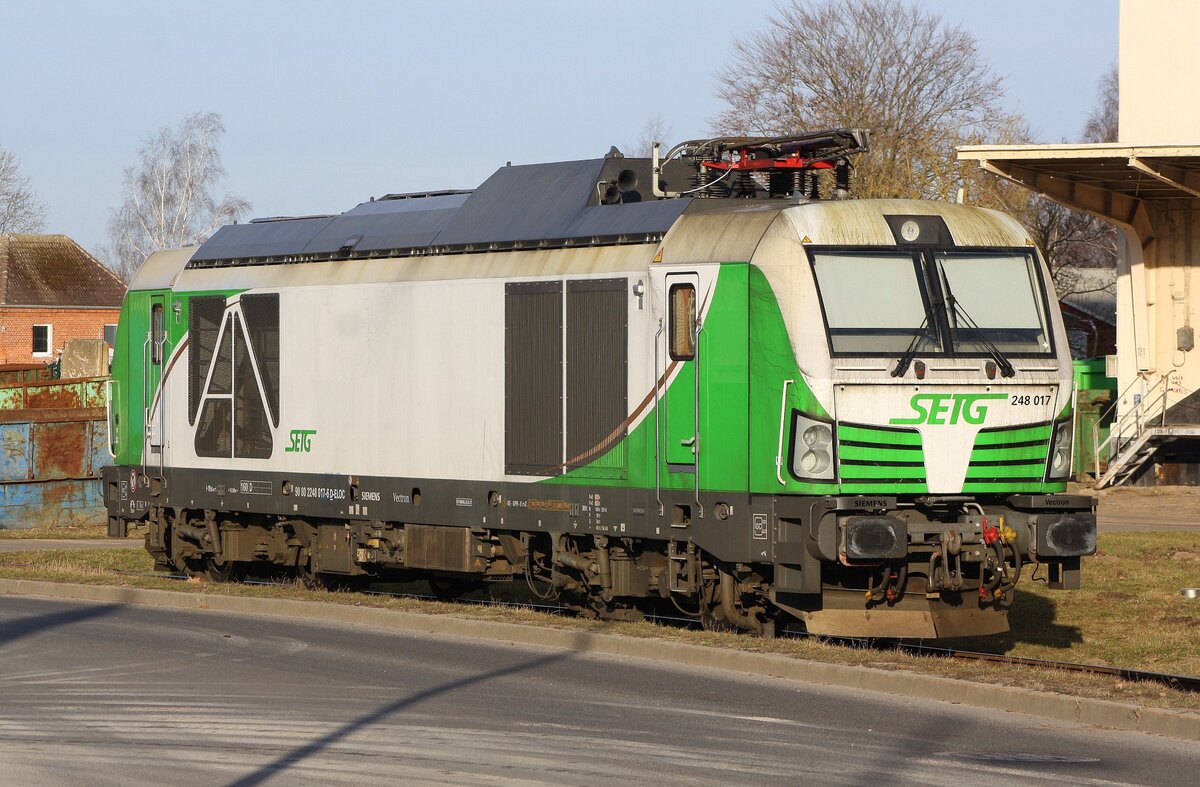 193 204 mit Holzzug von Rostock-Bramow nach Stendal-Niedergörne bei der Durchfahrt am 10.04.2026 im S-Bahnhof Rostock-Holbeinplatz.