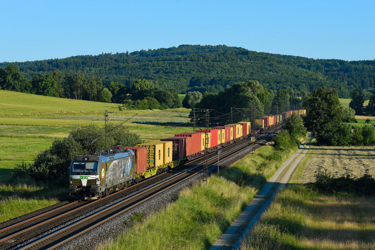 Im warmen Abendlicht rauschte der "Beethoven-Vectron" 193 218 der SETG mit dem Containerzug DGS 52657 von Regensburg nach Bremerhaven Speckenbüttel am 19. Juni 2025 durch die Vorderrhön bei Hünfeld. Christoph Schneider