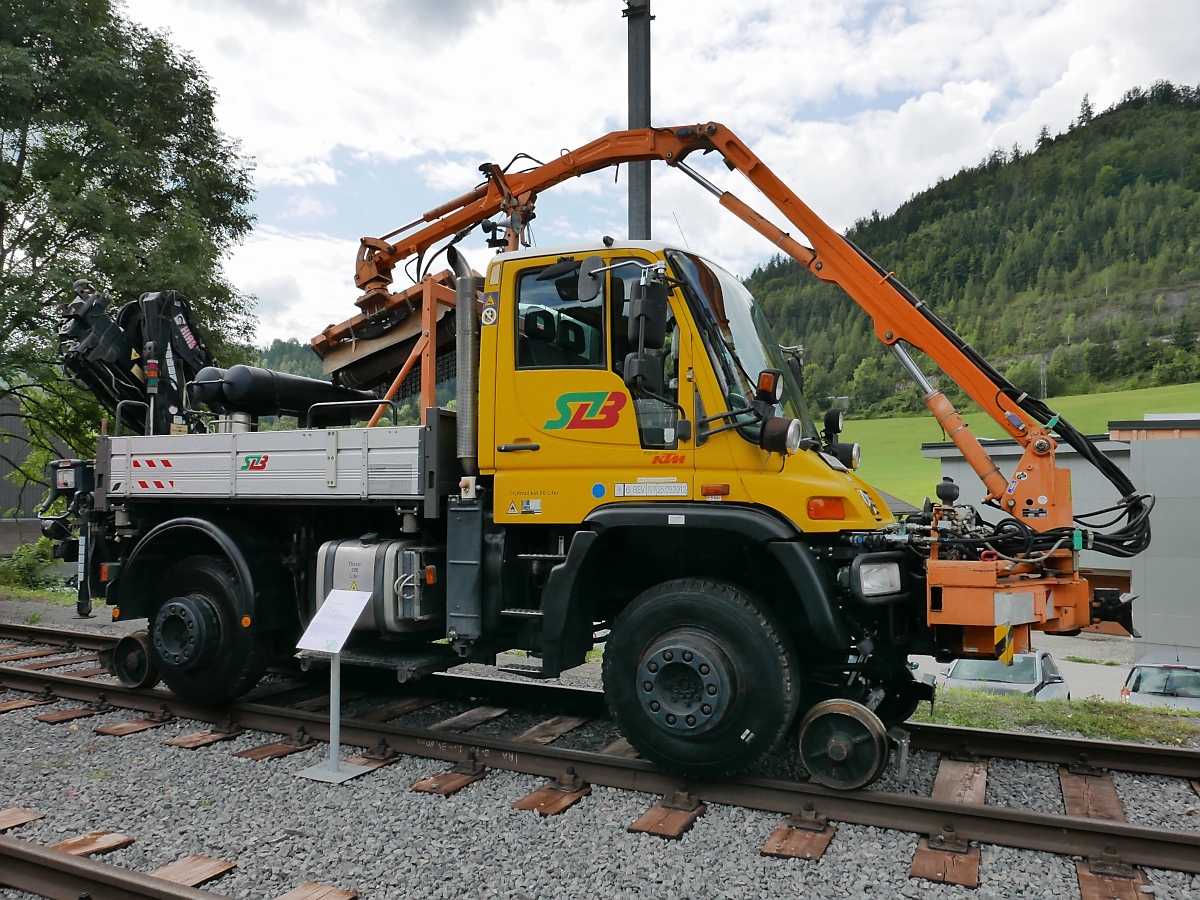 Zweiwege-Unimog U400 der Steiermärkischen Landesbahnen im Bahnhof Übelbach anlässlich einer Fahrzeugausstellung zur 100-Jahr-Feier der Strecke Peggau-Übelbach, 04.08.2019