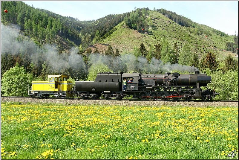 So wie schon in den letzten Jahren, kam auch heuer wieder die 52.4984 zur Revison in die HW nach Knittelfeld. Dieses Foto zeigt sie als SProb 97821 bei der Lastprobefahrt nach Pöls.Bei dieser Fahrt wurde auch die Werkslok JW DH 400 der Zellstoff Pöls AG überstellt. Fohnsdorf 08.05.2009