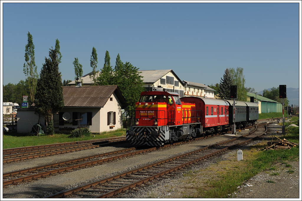 Die Verschublok V 20 012 von Stern und Hafferl (Linz) fährt mit offenen Güterwagen Richtung Bad Schallerbach. Trotz Suchens konnte ich keine Kategorie für die Lok finden.. [30.09.06]