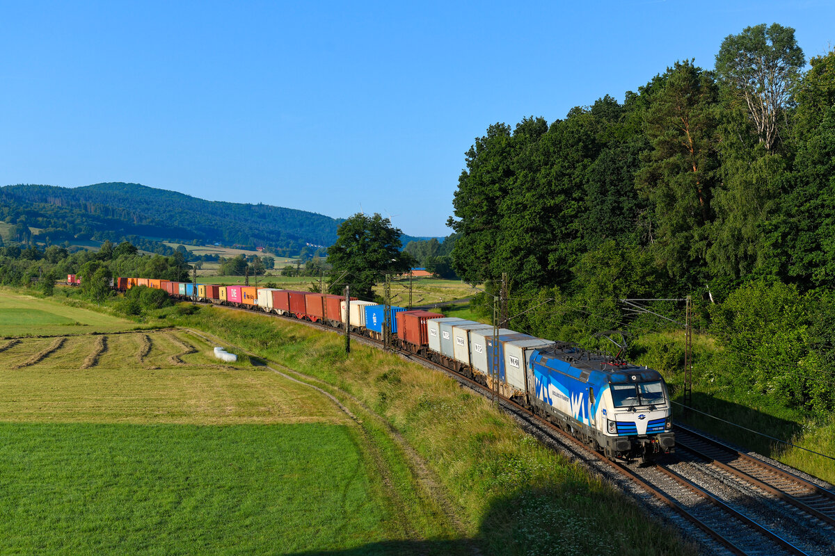 Schön bunt beladen zeigte sich der Containerzug DGS 42943 von Weddewarder Tief nach Enns in Oberösterreich am 21. Juni 2025. Dadurch hob sich der Zug, der für die Wiener Lokalbahnen Cargo verkehrte, bei Hermannspiegel in der Landschaft der Vorderrhön gut ab. Zuglok war die von ELL angemietete 193 238. Christoph Schneider