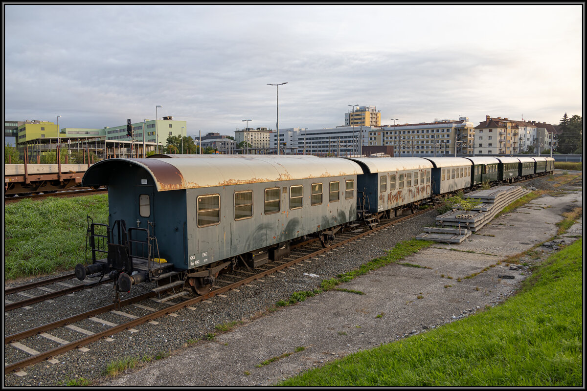 Ein "Ganzzug" aus vergangenen Zeiten ,.. Am 1.Oktober 2023 wartet diese hostorische Garnitur auf die nächsten einsätze und teilweise auf die weitere aufarbeitung. Graz Köflacher Bahnhof von einem Parkplatz aufgenommen. Karl Heinz Ferk