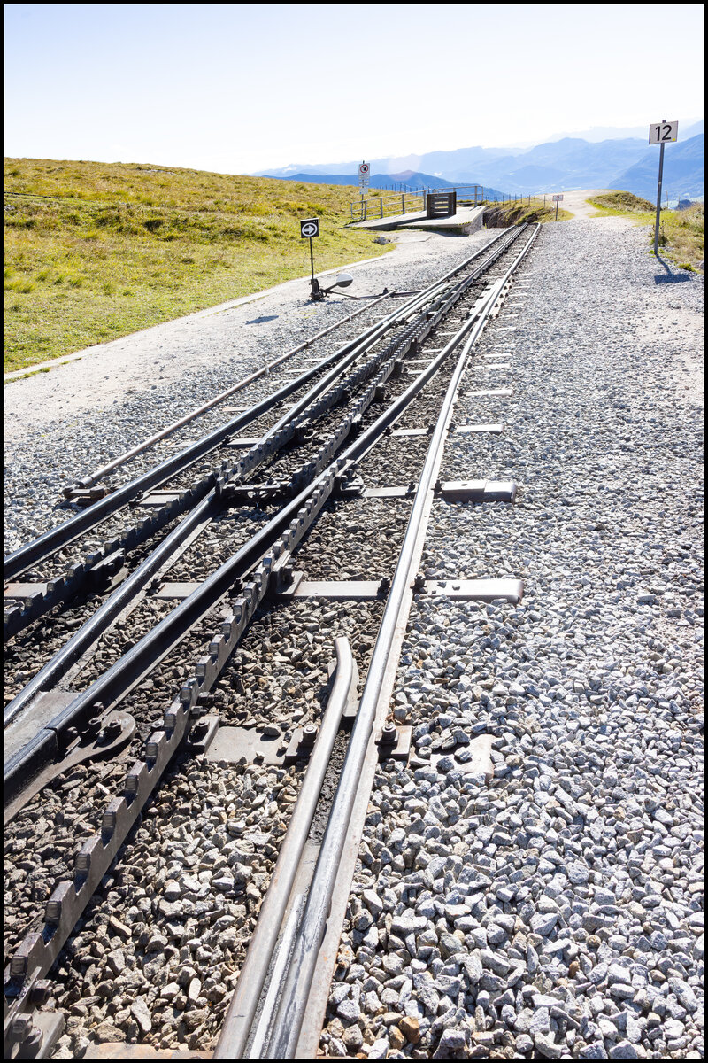 Wie ein Brückenstellwerk sieht das Empfangsgebäude im Bahnhof Schafbergspitze aus das Zugleich als Bahnsteigzugang dient . Davor im Bild die oberste Weiche der Schafbergbahn , in Grundstellung zur Fahrt von rechts / nach links . 15.09.2025