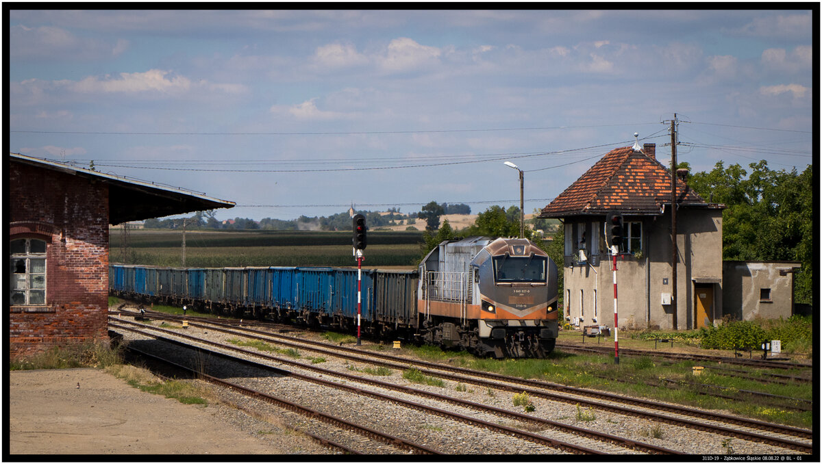 Blick auf das Stellwerk3 in Gorzow Wielkopolski während rechts 630 086-7 die letzten Sonnenstrahlen genießt.