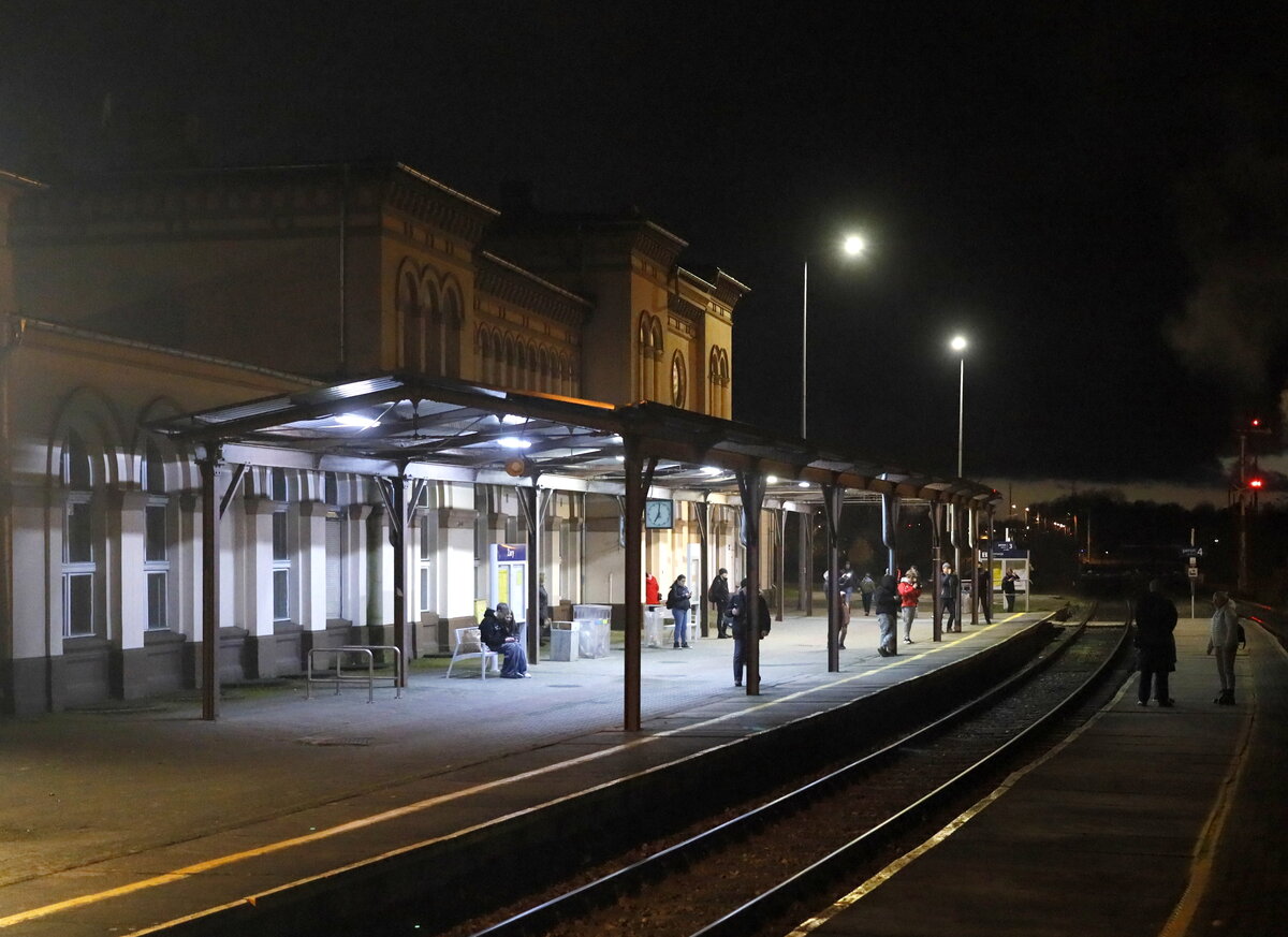 19:00 Uhr, Zary, der Sonderzug ist wieder auf dem Wege nach Cottbus, am Bahnsteig 1 in Zary warten einge Fahtgäste zum TW nach Zagan. 16.03.2024 19:00 Uhr, Siegfried Heße