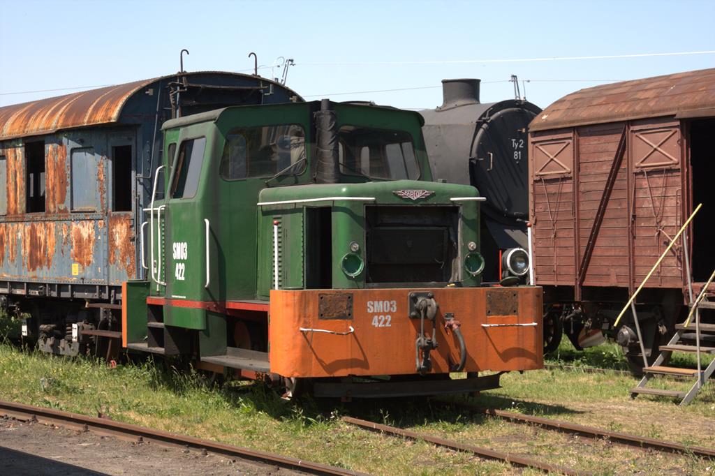 Dieselmechanisch ist die SM03 422, ebenfalls hergestellt von Fablok, fotografiert am 13.05.2023 im Eisenbahnmuseum Jaworzyna Śląska
