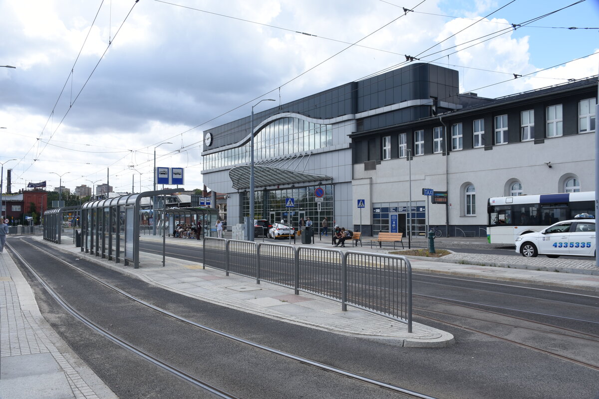 SZCZECIN (Woiwodschaft Westpommern), 09.07.2025, Blick von der Straßenbahnhaltestelle auf den Haupteingang des Bahnhofs Szczecin Główny Reinhard Zabel