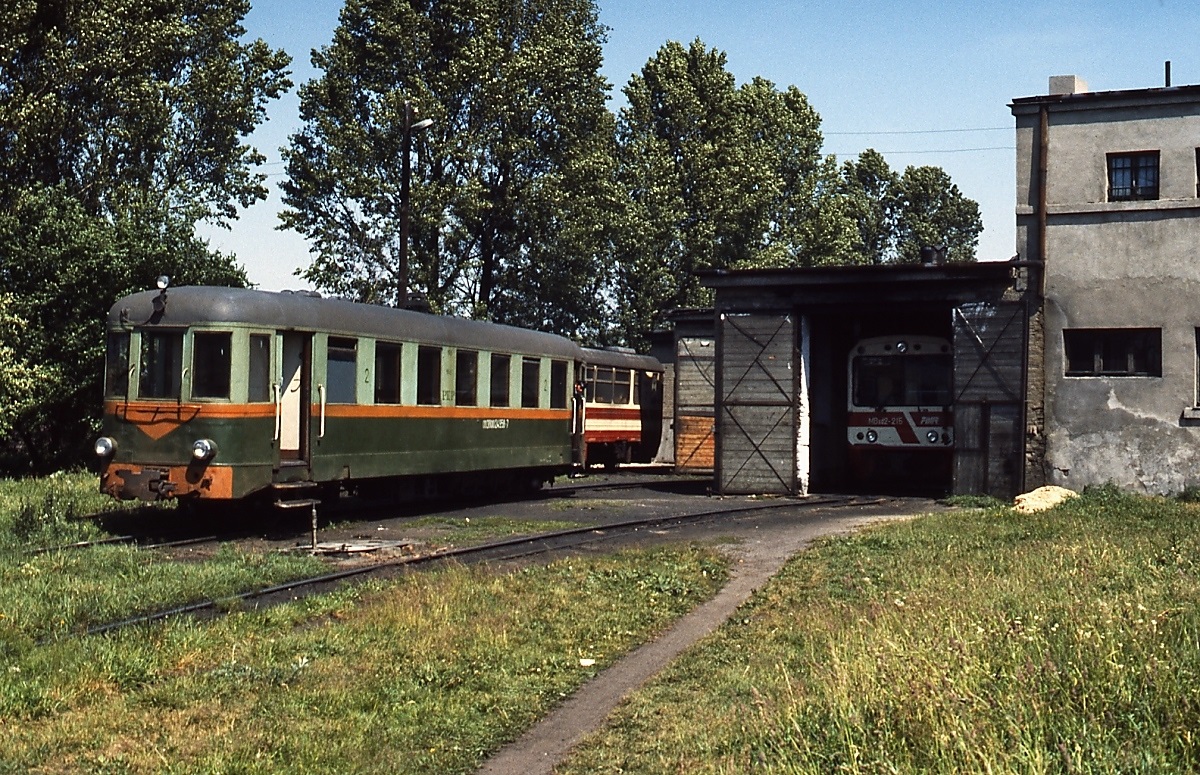 Schmalspurbahnen in Polen: Im Juni 1990 herrschte noch recht reger Personenverkehr auf dem 750 mm-Netz der Krosniewicka Kolej Dojazdowa, hier stehen MBxd2-229 und ein MBxd1 in Krosniewice abfahrbereit. Aber auch diese Bahn wurde im Jahre 2001 von der PKP stillgelegt, nach der Übernahme durch die Gemeinde Krosniewice fand einige Jahre noch ein sporadischer Verkehr statt. Horst Lüdicke