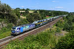 DB Cargo AG [D] mit der angemieteten polnischen MRCE Dispo "ES 64 F4-459" [NVR-Nummer: 91 51 5170 033-2 PL-DISPO] und einem PKW-Transportzug Richtung Frankfurt/Oder weiter nach Polen am 11.11.21 Durchfahrt Bf. Golm.